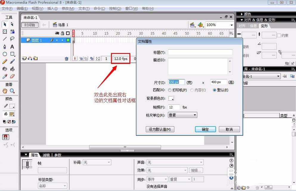 4、在彈出”文檔屬性“對話框中可以看到如圖所示的幀頻(f):12fps 的設置,直接修改框里的數值,然后點”確定“,修改完成。如果想動畫快數值要變大。一般常見設置24的比較多。