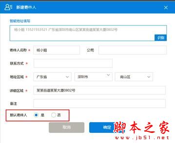 2、 步驟二,填寫寄件人信息,設為默認,點擊確定即可