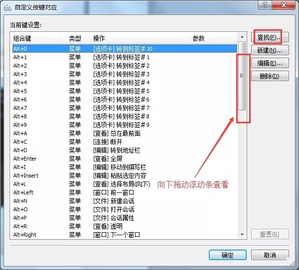 在自定義按鍵窗口里,可以看到當前鍵的設置,可以看到系統默認的快捷按鍵的一個列表。可以拖動豎向滾動條查看列表下方的快捷按鍵,也可以使用右側的一個查找功能查找快捷按鍵。