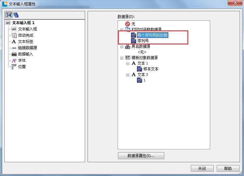 然后我們雙擊文本輸入框,以打開文本輸入屬性對(duì)話框。將對(duì)話框切換至“鏈接數(shù)據(jù)源”選項(xiàng)卡,在右側(cè)數(shù)據(jù)源列表中選擇“副本”。意思是表單打印數(shù)據(jù)輸入選項(xiàng),對(duì)應(yīng)的就是指定每個(gè)標(biāo)簽的打印數(shù)量。單擊關(guān)閉即可。