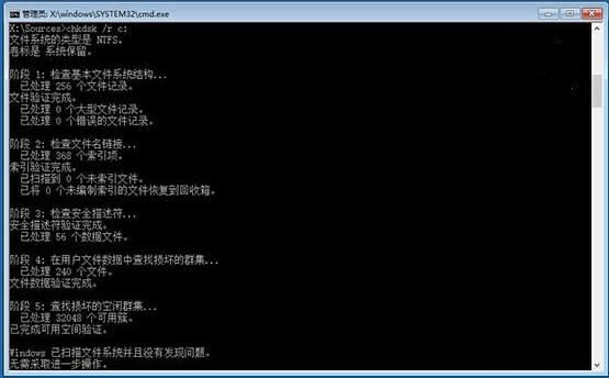 最后輸入chkdsk /r c:回車,系統會自動檢查文件系統錯誤,檢查完成、重啟電腦,一般情況下即可恢復正常。不過在重啟之前,建議大家再執行一下系統文件修復命令,來修復系統中可能已損壞的文件。