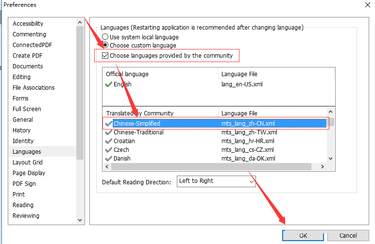 5、選中 Choose languages provide by the community, 然后下拉列表找到 Chinese-Simplified并鼠標單擊,然后選擇OK鍵: