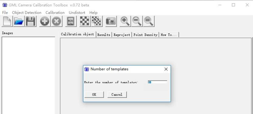 彈出對話框如下,要求輸入模板數(shù)量,這里模板數(shù)量是指你照片中棋盤格的種類數(shù)量,比如:只有照片中只有一張棋盤格就填寫1,照片中有兩張棋盤格就填寫2,以此類推。