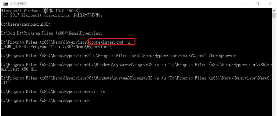 進入到Hypervisor 目錄后輸入“comregister.cmd -u”并按回車鍵