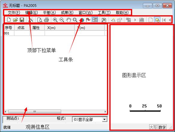 平差易2005主界面中包括測站信息區、觀測信息區、圖形顯示區以及頂部下拉菜單和工具條