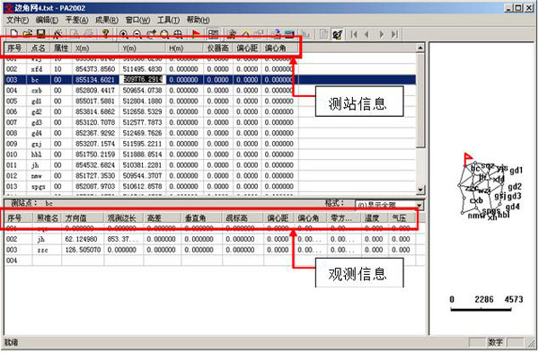 2、PA2005為手工數據鍵入提供了一個電子表格, 以“測站”為基本單元進行操作, 鍵入過程中PA2005將自動推算其近似坐標和繪制網圖。