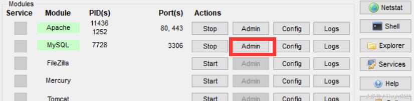 數據庫名怎么查找呢,我們打開XAMPP,點擊MySQL右邊的admin,就可以進入數據庫管理頁面。