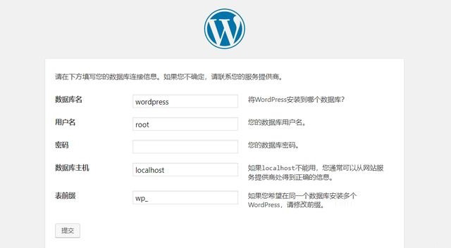 我們選擇中文,點擊繼續,進入這個頁面后,我們需要填寫一些配置信息,數據庫名獲取看下一步。主機名默認即可,或者填入127.0.0.1,前綴也不用更改,用戶名root,密碼為空,默認都是這樣的,當然你也可以在數據庫頁面自己創建一個用戶,請看下一步。