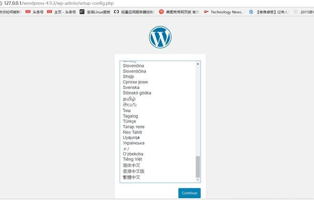 三、我們打開瀏覽器輸入http://127.0.0.1/wordpress-4.9.2就可以進去了,也就是說如果你直接放在htdocs目錄下,那么直接訪問127.0.0.1即可,如果你是放在了這個目錄下的某個地址,那么就在127.0.0.1加上你的目錄地址即可訪問,如下圖所示我們可以看到進去安裝頁面了。
