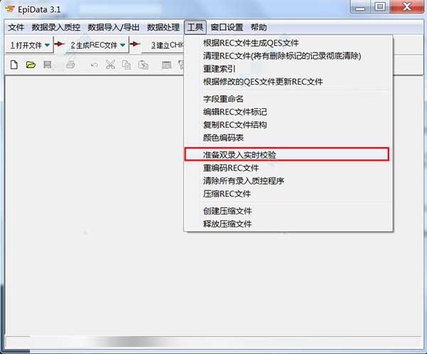 用戶在進行數據輸出后輸出為新的Epidata文件,從文件選擇需要進行雙錄入檢驗的記錄進行輸出,在“工具”欄中選擇“準備雙錄入實時檢驗”進行文件的效驗檢查,如圖所示: