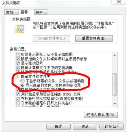 打開 開始菜單 (Windows 8 請(qǐng)按下Windows 按鍵 + Q),在 搜索程序和文件 中輸入 文件夾選項(xiàng) ,選擇 查看 標(biāo)簽,下拉找到并選擇 顯示隱藏的文件、文件夾和驅(qū)動(dòng)器 。