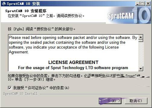 2、閱讀SprutCAM v10安裝協議,勾選“我接受許可證協議中的條款”,點擊【下一步】
