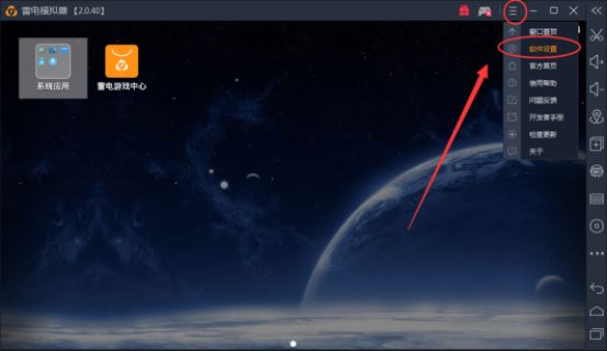 2、或者也可以在雷電安卓模擬器界面右上角的“菜單”中打開“軟件設置”;