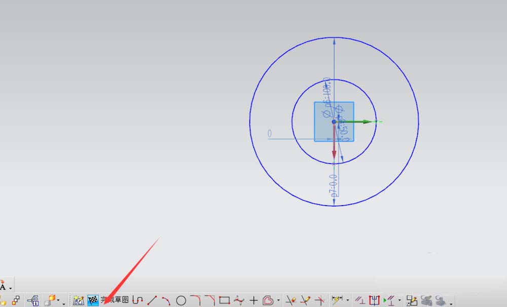 3、進入繪圖界面后,底部是草繪命令,如下箭頭所示,選中圓命令后會出現(xiàn)繪圖基準面。