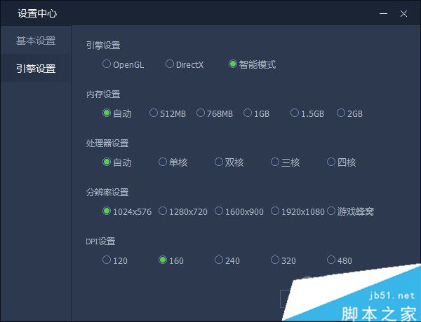 選擇引擎設(shè)置,目前有三種模式可以選擇,分別為OpenGL,DirectX和智能模式