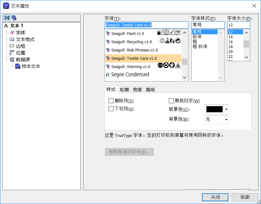 2、在字體欄中選擇“Seagull: Textile Care v1.0”字體。