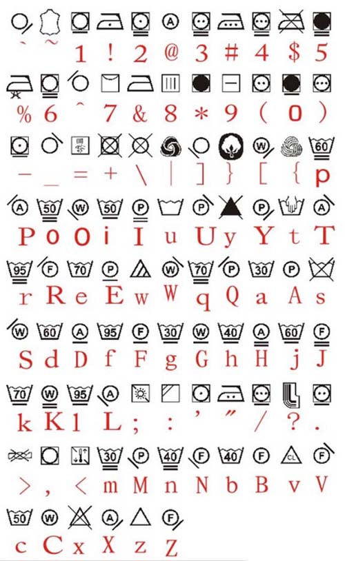 3、然后根據(jù)下圖對(duì)照表,在數(shù)據(jù)源中輸入對(duì)應(yīng)的字符,它就會(huì)顯示相應(yīng)的洗滌圖標(biāo)。