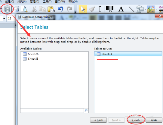 2、點擊窗口上方的柱型按鈕,在彈出的向導中添加excel數據源(即整理的數據源明細表),跟隨向導完成數據庫添加即可,最后單擊“完成”即可。