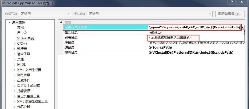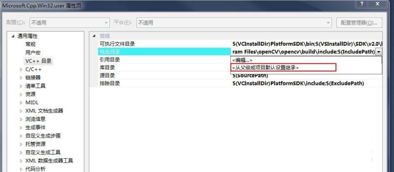 3、如:我之前因為配置了OpenCV的路徑,后來新建其他項目就出現devenv.exe應用程序錯誤。解決方法是,到項目的【屬性管理器】→【Microsoft.cpp.Win32.user】→【VC++目錄】→【包含目錄】和【庫目錄】中,把OpenCV的目錄都去掉(或者把你不用的路徑去掉),以避免頭文件的沖突