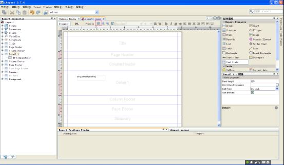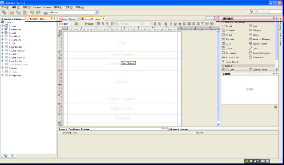 圖中,左邊標(biāo)記為頁面監(jiān)視器(report inspector),右邊為組件工具欄。若客官您在使用的過程中,不小心關(guān)閉了這些窗口,您可以在菜單欄“窗口”中找到,點(diǎn)擊之后,該窗口就會出現(xiàn)了。