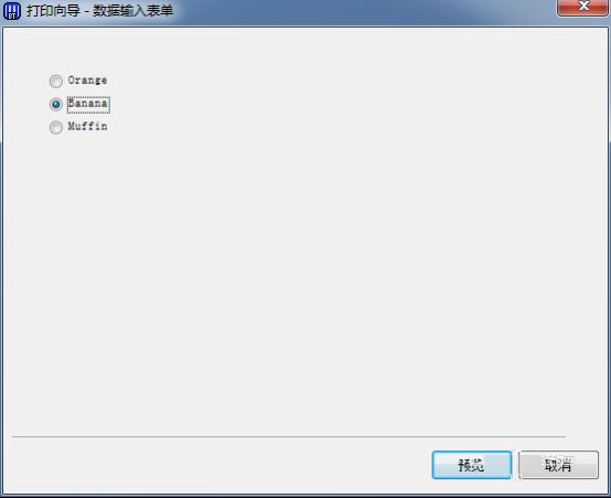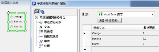 假設(shè)要銷售三種產(chǎn)品:一個(gè)橙子成本2元,一根香蕉成本2.2元,一塊松糕成本5 元。 您想要數(shù)據(jù)輸入表單顯示三個(gè)單選按鈕,一個(gè)表示橙子,一個(gè)表示香蕉,一個(gè)表示松糕。 但是,當(dāng)執(zhí)行打印作業(yè)時(shí),您想要打印不帶產(chǎn)品名稱的價(jià)格標(biāo)記。 為了填充單選按鈕列表,您將使用以下 VB 腳本: