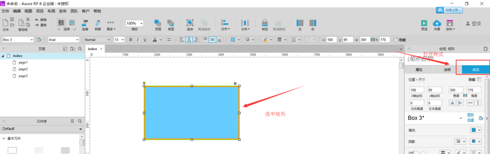 2、選中矩形,在頁面右側(cè)的“檢視”窗口中,切換到“樣式”
