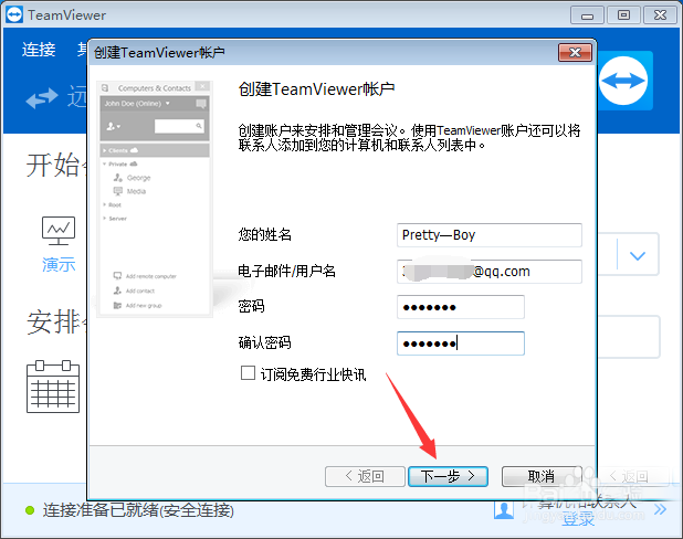 4、創(chuàng)建teamviewer帳號的時候輸入姓名、郵箱密碼等信息然后點擊下一步。