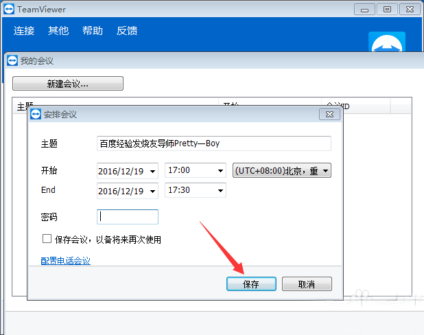 7、新建會議以后teamviewer中出現(xiàn)安排會議窗口,輸入teamviewer會議主題、開始和結束時間,同時可以設置密碼然后點擊保存。