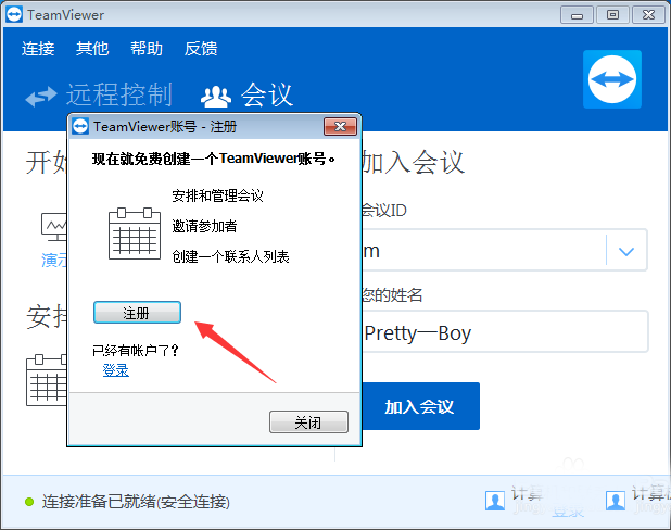 3、使用teamviewer創(chuàng)建會議需要我們有一個帳號,如果沒有點擊注冊。