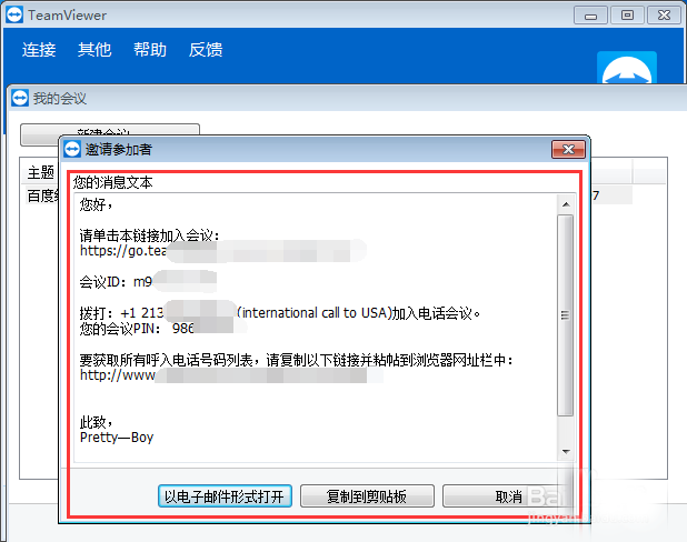 8、teamviewer創(chuàng)建會議成功以后會出現(xiàn)邀請參加者,有teamviewer會議鏈接、會議ID、以及電話會議號碼等。