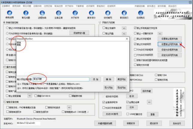 設置禁止網頁列表:勾選“禁止打開的網頁”,點擊“設置禁止網頁列表”,在彈出的窗口中輸入要禁止打開的網站名稱,例如禁止新浪網站,只需輸入“新浪”,點擊“添加”,關閉窗口后即刻生效。設置“只允許打開的網頁”方法相同。如下圖: