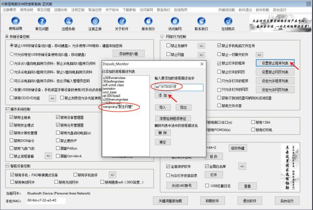 插上U盤,勾選“只允許特定USB存儲設備使用”,點擊“添加特定U盤”,在彈出的窗口中將左側序列號選中(插上U盤后自動顯示),添加至右側列表,然后關閉窗口。設置完成后,這臺電腦就只能識別許可列表中的U盤,其它U盤插入電腦后則不顯示。U盤列表可以批量導入或導出。