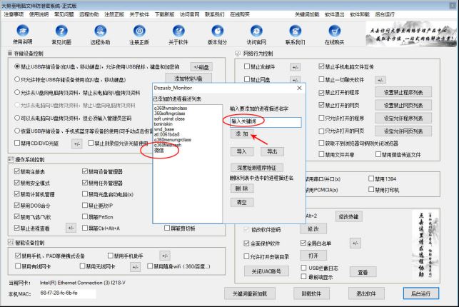 勾選“禁止打開的程序”,點擊“設置禁止程序列表”,在彈出的窗口中輸入關鍵詞,例如“微信”,添加至左側列表,然后關掉小窗口,立即生效,打開微信程序,會立刻閃退。設置“只允許打開的程序”方法相同。如下圖: