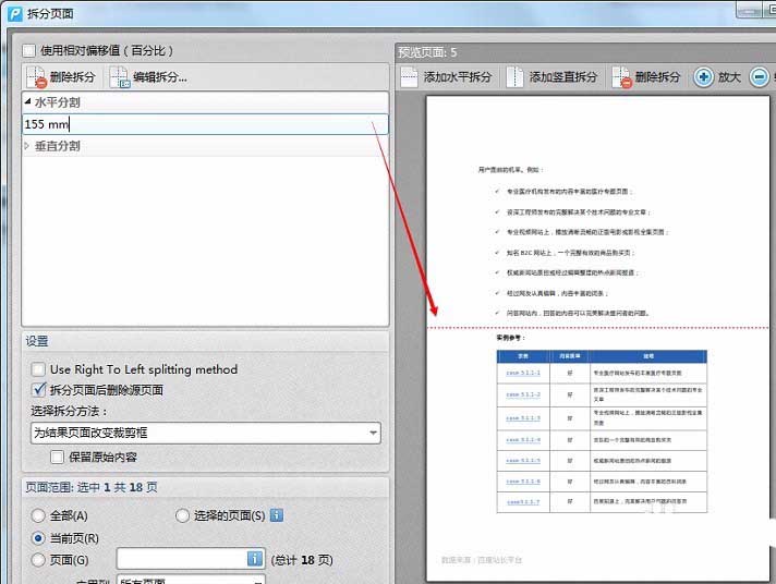 5、在預覽頁中可以移動調節拆分線的位置。在對話框左邊可以對拆分線編輯以及位置的精確調整。