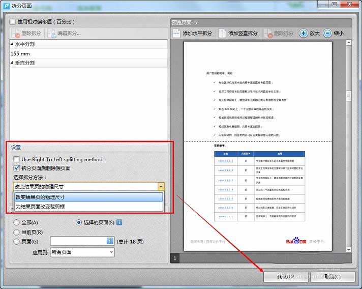 6、最后在設置選項中選擇頁面的拆分方法,以及是否保留源頁面。點擊確認,頁面就拆分好了。