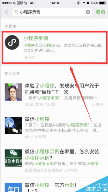然后輸入關鍵字“小程序示例”,然后點擊搜索框下面的“搜一搜 小程序示例”
