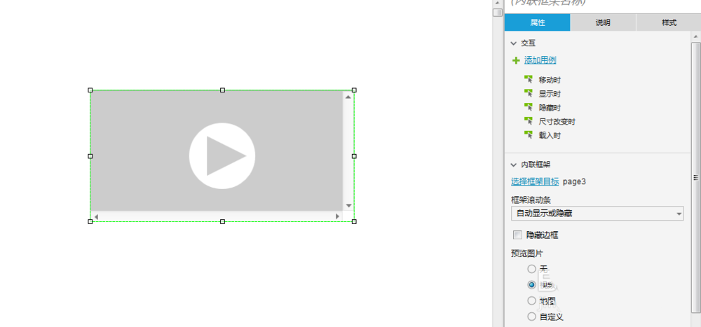 5、在“page 3”頁面拖一個矩形框元件到畫布上,并修改內容為“視頻”,如下圖所示: