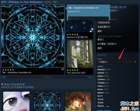 打開創意工坊后,往下翻,可以看到熱門的壁紙推薦,在箭頭所指的地方篩選壁紙類型