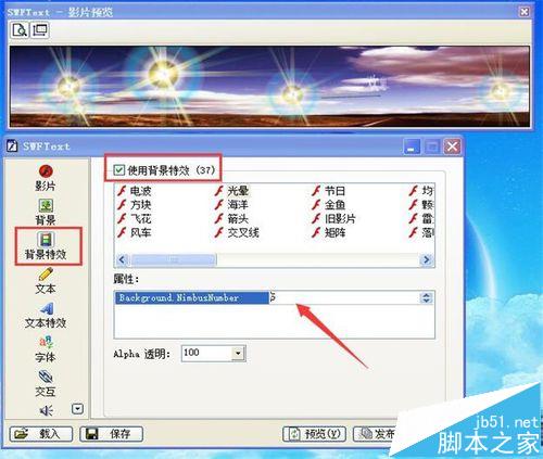 4、背景特效:是在已有背景上再添其它特效,比如:光暈,舊影片,金魚等,屬性框設置元素的個數。