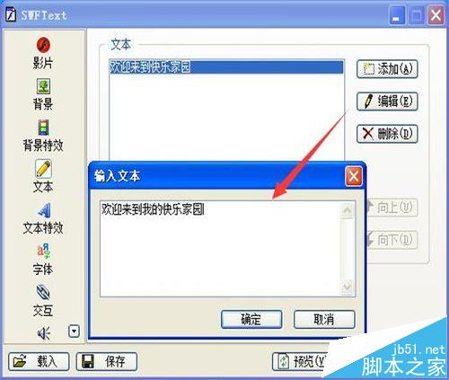 5、文本:添加廣告文字,例如:歡迎來到我的快樂家園,點擊確定,如需修改文字點擊編輯。