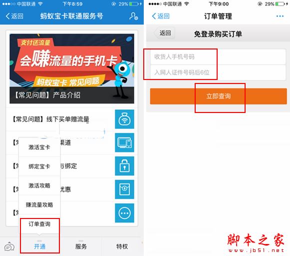 一、首先進入到螞蟻寶卡的訂單查詢界面,輸入聯系人電話號碼和入網證件后面6位數字,如圖所示。