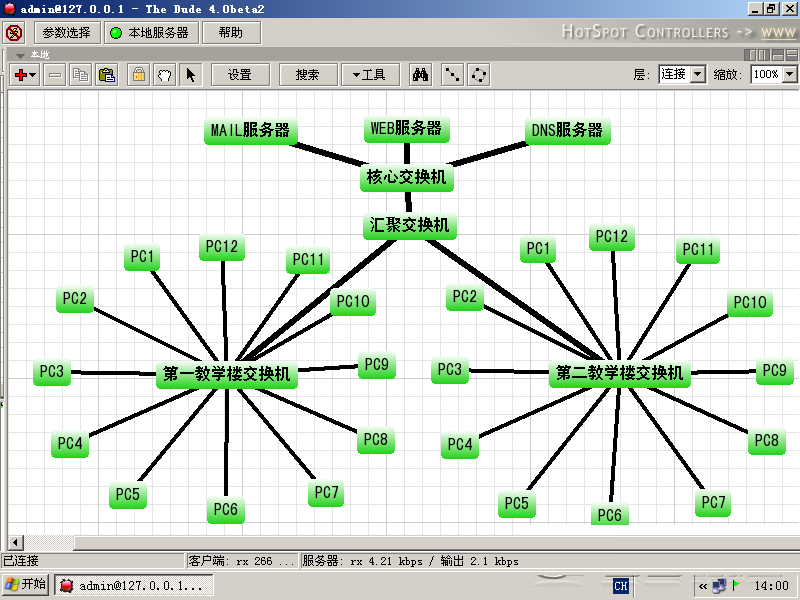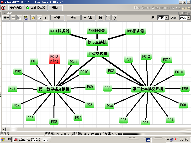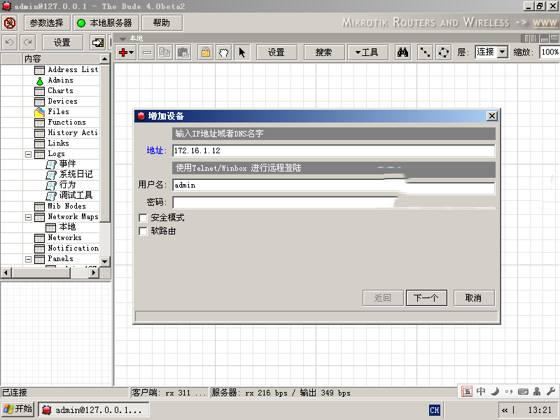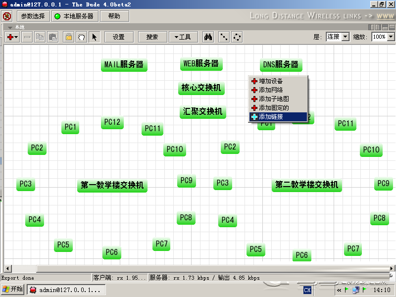 The Dude是MikroTik開發的一款免費的網絡管理與監控軟件,能有效提高你對網絡設備的管理和監控能力。 能自動搜索在指定子網內的所有設備,繪制并生成你的網絡拓撲圖,監測你設備的服務端口。