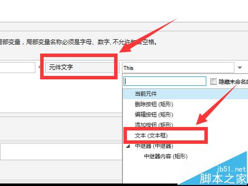 6、根據下圖所示,設置局部變量:先選擇”元件文字“,再選擇元件”文本“,意思是:變量 等于 所選擇元件的文字;