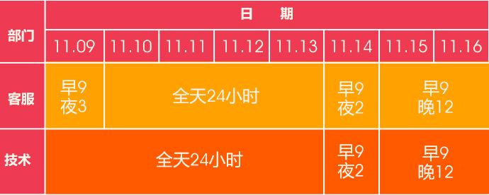 四、以下是我們客服部、技術部雙十一期間值班時間安排表: