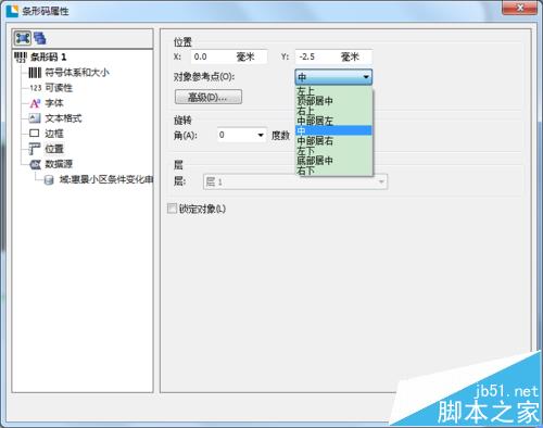 3、將對象的參考點設置為“中”。即當數據變長時,條碼長度會以中心向兩側延伸。這樣就保證了BarTender條碼保持居中。