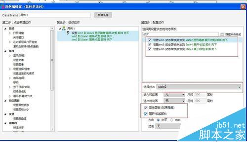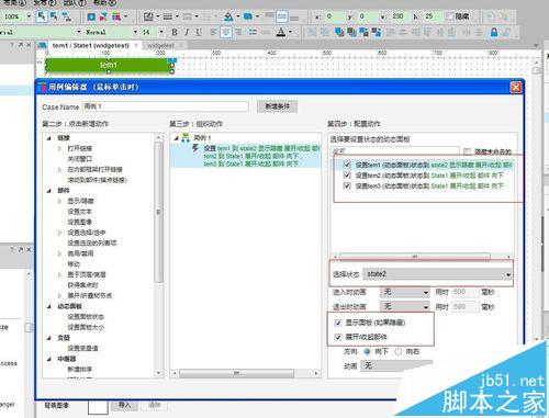 5、對tem1按鈕添加鼠標點擊效果用例。其中需要注意的時,state1狀態和state2狀態的轉換效果。如果設置從隱藏狀態state1到state2效果時,三個模板狀態的勾選。模板如果要選擇的狀態為顯示狀態,則同時勾選“顯示面板(如果隱藏)”和“展開/收起部件”,模板如果要選擇的狀態為隱藏狀態,則只需勾選“展開/收起部件”。對于該頁面內出現的面板都要進行狀態設置