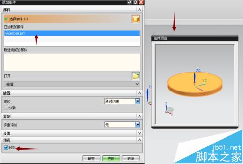 5、點擊圓盤,呈現圓盤建模的預覽形式,已加載對話框里出現了圓盤的英文名字。同時將對話框的預覽對號取消,也可以不出現圖形預覽,然后點擊確定即可將圓盤模型放置在裝配模塊里了。