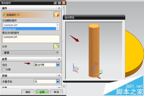 7、點擊添加組件,彈出添加組件對話框,同上進行添加直銷,不同的是,這里的放置定位需要選擇約束。為什么沒有選擇絕對圓點那?因為我們需要對圓盤和直銷進行組裝,只要將第一個零部件進行固定位置即可。