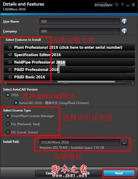 2、勾選需要的安裝文件、AutoCAD版本、許可文件、以及安裝路徑,點擊“next”。