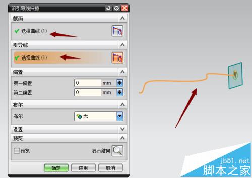 5、點擊沿引導(dǎo)線掃掠,彈出,彈出沿引導(dǎo)線掃掠對話框,需要做的就是,選擇要掃掠的截面和選擇要沿著哪條引導(dǎo)線進(jìn)行掃掠